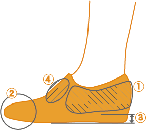 - 前足部は締め付けられることの無いデザインであること